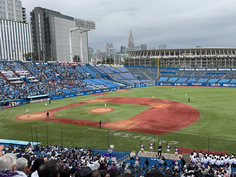 Wenn man sich auf die Ōendan konzentriert, könnte man das Baseballspiel im Hintergrund fast vergessen. Dort hatten wir diesmal aber großen Grund zur Freude: Die Waseda-Universität gewann den gesamten Wettkampf ohne eine einzige Niederlage erlitten zu haben!